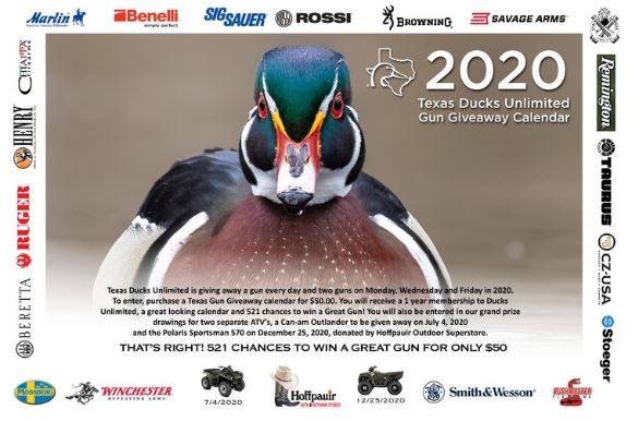 | Texas Ducks Unlimited is giving away a gun every day and 2 gun every Monday, Wednesday, and Friday. That is 521 chances to win a great gun! Each calendar purchase will also include a grand prize entry for one of two Polaris Sportsman 570 4 Wheelers. 4 wheelers will be drawn July 4th 2020 & December 25th 2020 Each calendar also comes with a 1 year membership to Ducks Unlimited $50 Per Calendar |