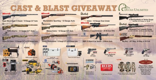 $3000 Cast and Blast Sponsor for your choice of 1 item from the Cast and Blast list or 2 from the Great Gun List, 1 table (8 seats) and would include dinner for 8 people, as well as (8) one year subscriptions to Ducks Unlimited. Also included would be 8 Fort Worth DU Pint Glasses, DU hats and DU Headlamps, one for each person.Table purchaser would receive (1) $100 book of tickets for the raffles, 1 Game Guard Cooler Bag with TX DU logo, and sponsor recognition in program as well as the sponsorship scroll displaying on 4 large screens throughout the venue.